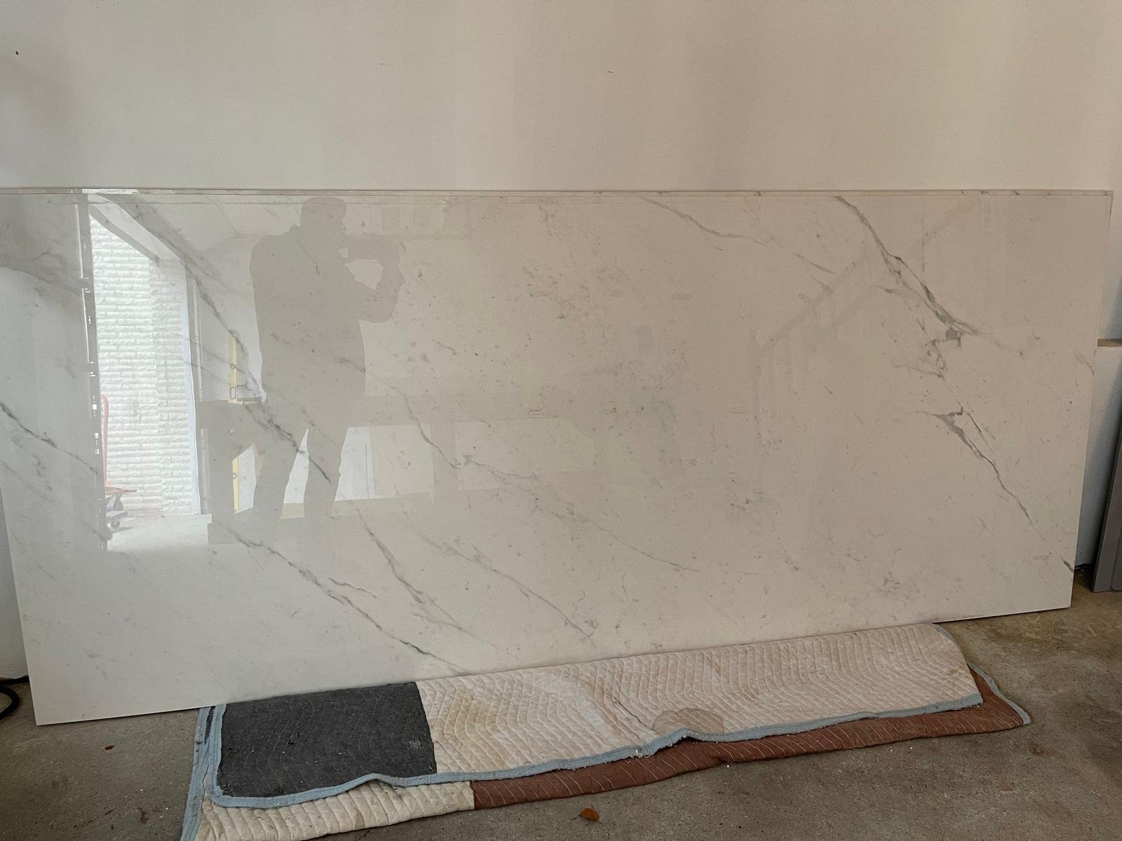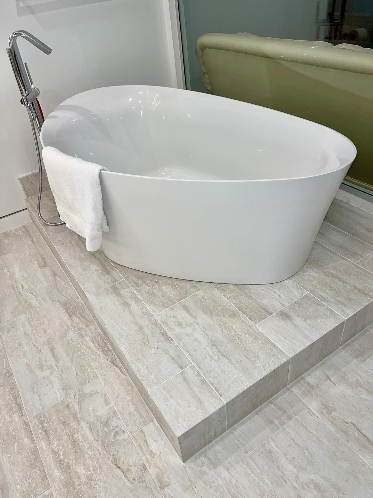 Large-format porcelain slab with seamless, continuous joints. We use epoxy grout and precision mitered corners — the hallmark of true luxury installation.